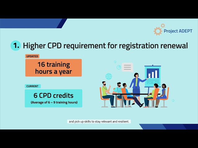 1. Higher CPD requirement for registration renewal | 5. New and tighter accreditation criteria and course instructional design requirements for CPD courses | |